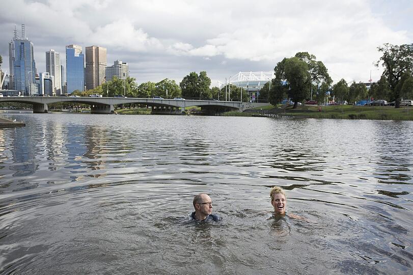Melbourne - Angelique Kerber hat ihre Ankündigung nach dem Titelgewinn bei den Australian Open wahr gemacht und ist am Sonntagmorgen Ortszeit in den Yarra River gesprungen. "Das hat sich gelohnt, das war es wert", sagte die neue Nummer zwei der Weltrangliste. Auch ihr Trainer Torben Beltz und Physio Simon Iden ließen sich unmittelbar in der Nähe der Rod-Laver-Arena im Melbourne Park in den Sprung in den Fluss nicht nehmen.