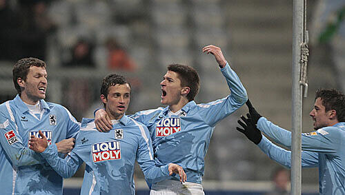 MÜNCHEN - Die Löwen feiern das 3:0 gegen Rostock und ihren Kapitän und Rückkehrer Benny Lauth. Nach sieben Spielen ohne Niederlage rangiert 1860 jetzt schon auf Platz 8 – und die Tendenz geht nach oben.
