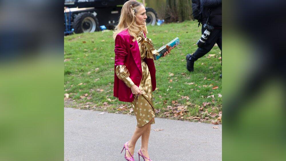 Carrie Bradshaw alias Sarah Jessica Parker (57) ist als Modeikone bekannt. Auf neuen Aufnahmen vom Set der zweiten Staffel des "Sex and the City"-Ablegers "And Just Like That..." ist Parker nun erneut in einem interessanten Outfit im 80er-Jahre-Stil zu sehen. Die Schauspielerin trägt auf den Bildern einen pinkfarbenen Blazer mit hochgeschobenen Ärmeln über einem langärmligen Kleid in Metallic-Gold, das bis über die Knie reichte und mit einer großen Schleife am Kragen und hellen Tupfen verziert war.